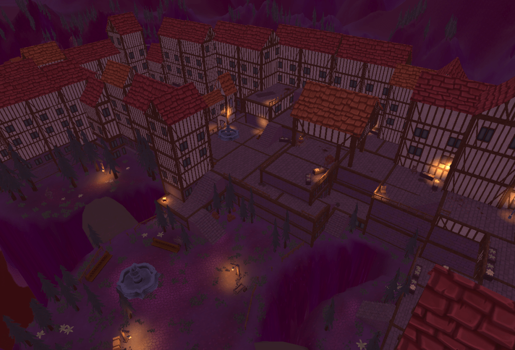 This was one of many mood boards constructed for “Dreadmoon” during the beginning stages of level design. The goal for this level was to create a sense of claustrophobia and vulnerability with tight streets while also allowing for a more open experience if the player utilized the rooftops for navigation.