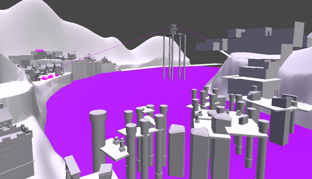 At this stage we can finally start working in engine to bring some of the ideas to life and see how they work! The goal for this stage is to create something rough and playable, nothing too polished, because everything is still subject to change at this point. Most of the time this can be achieved with just cubes, but for more complex shapes I’ve used tools like ProBuilder to create some quick geometry for testing. Generally I’m looking to establish scale, flow, and usability of the space so that it fits the goals set for the level. For example, if we want to create a multiplayer space that promotes close combat, having too many open spaces is bad. Instead, we want to create leading paths that are themselves decently sized for combat, but we want these to lead to main areas where players will spend the majority of their time.